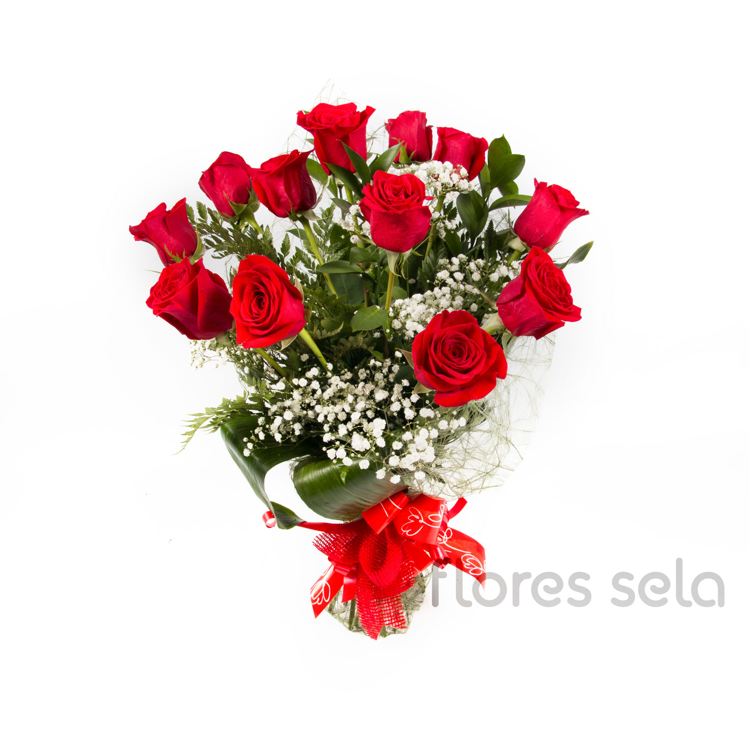 Docena de rosas rojas en ramo decoradas con verdes, paniculata y complementos que le favorezcan. Espectacular regalo para los enamorados. Envuelto con papel y celofán y decorado con un precioso lazo.