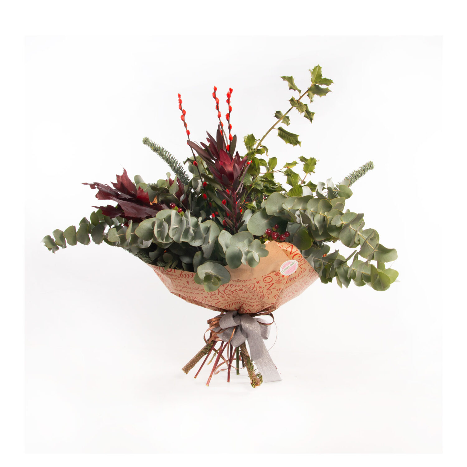 Ramo navideño de tendencia, con elementos como eucalipto, abeto, acebo, leucadendros, o cualquiera que encaje en esta preciosa composición. Siempre hecho con el criterio de nuestro equipo. Ramo que durara en nuestro hogar todas las navidades, y aunque se seque siempre quedara precioso.