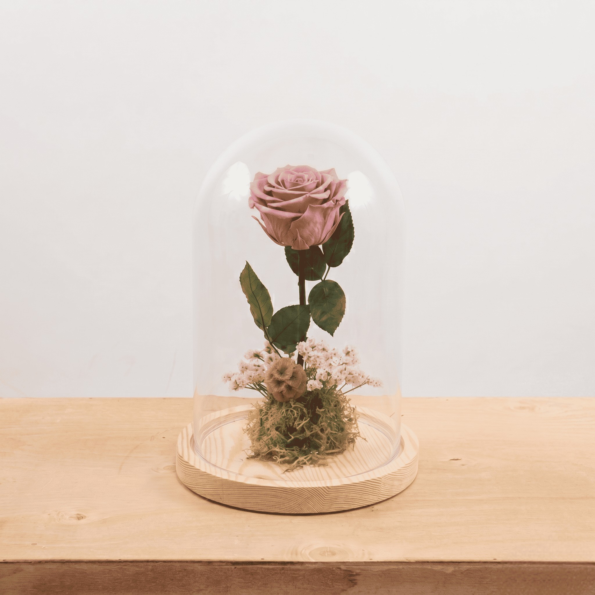 Rosa eterna en cúpula de cristal de color rosa, hay varios tonos de color rosa disponibles por lo que puede no ser exactamente la misma de la foto. Hemos añadido esta cópula con este color de rosa especialmente para el día de la MADRE por peticion vuestra. Las rosas liofilizadas o disecadas duran muchos años, en condiciones óptimas son prácticamente eternas. Las presentamos con un arreglo super romántico en una cúpula de cristal con base de madera. El regalo mas romántico para decir TE QUIERO !!! Al más puro estilo de la película «La Bella y la Bestia»